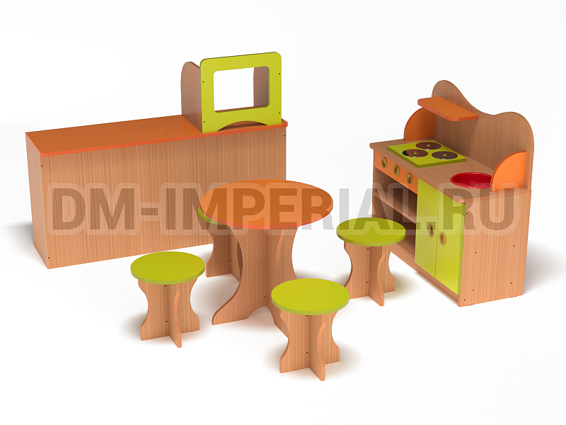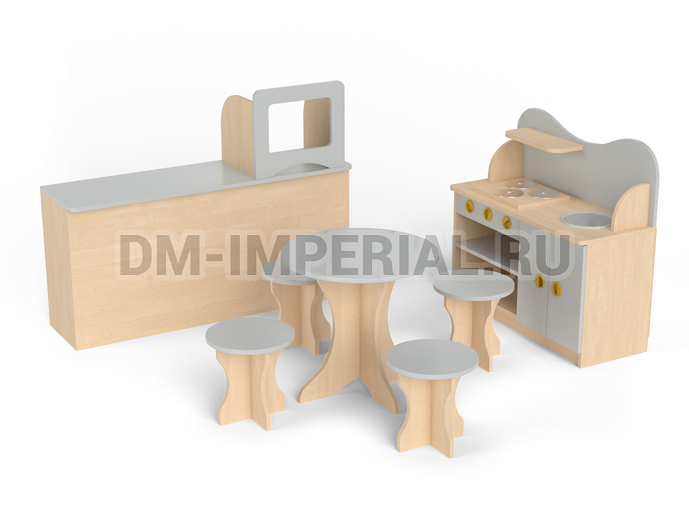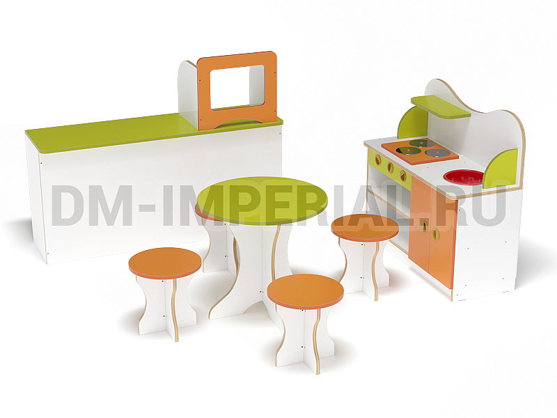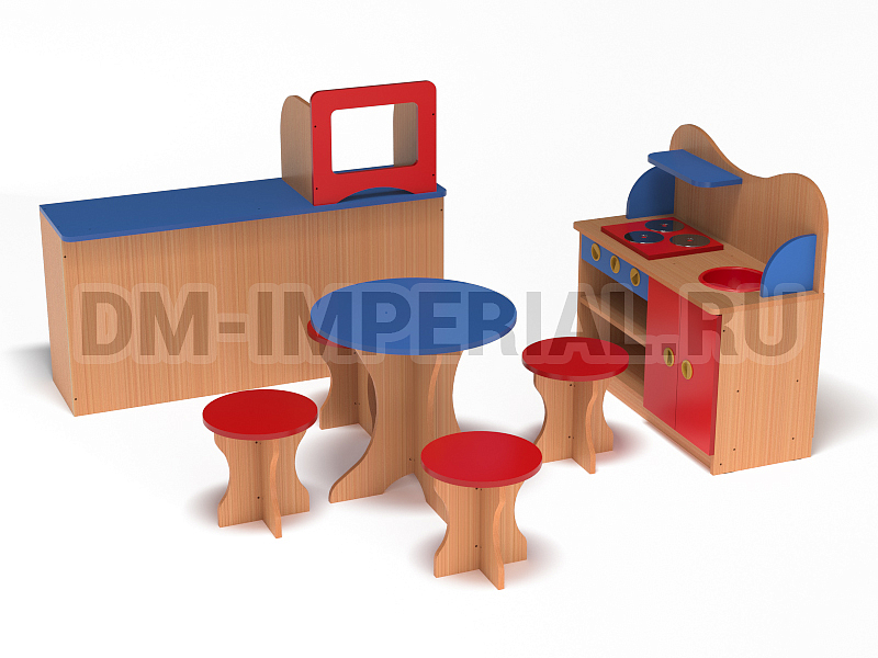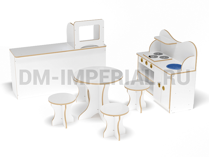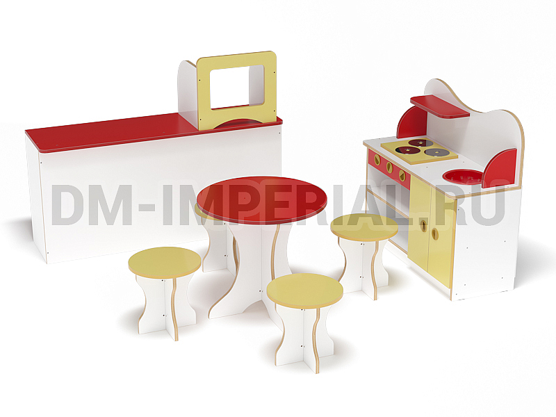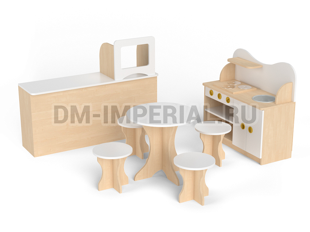 Представляем Вашему вниманию интересный игровой набор, выполненный в тематике кафе. В него входит прилавок, столик со стульчиками, а также небольшой кухонный гарнитур. Все предметы мебели высоко детализированы. На прилавке предусмотрена специальная зона, подходящая под кассовый аппарат. Гарнитур оснащается игрушечной варочной панелью и раковиной, полочками и шкафчиком.