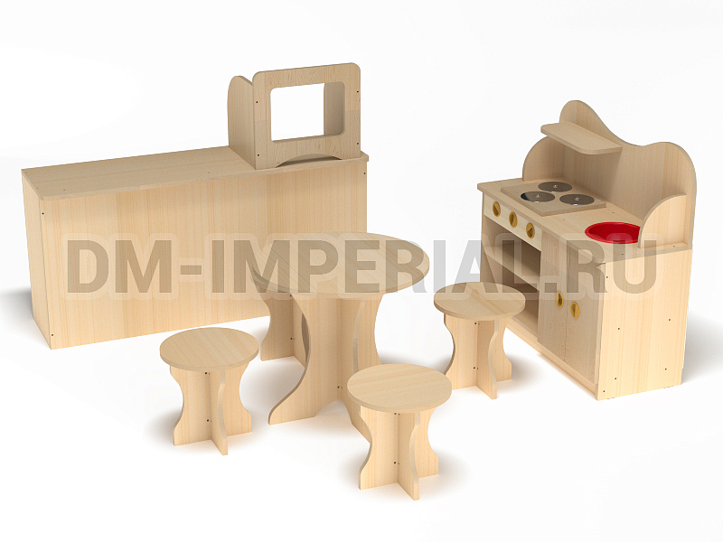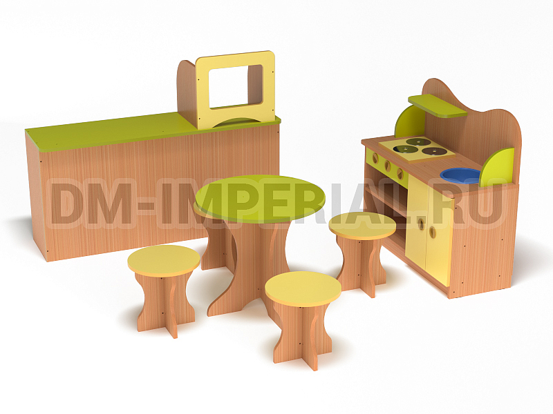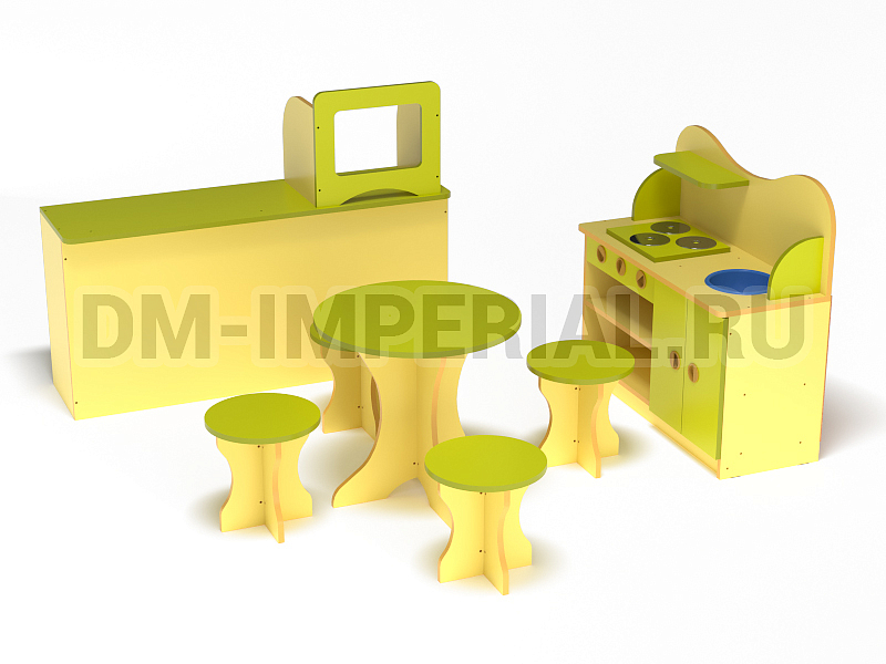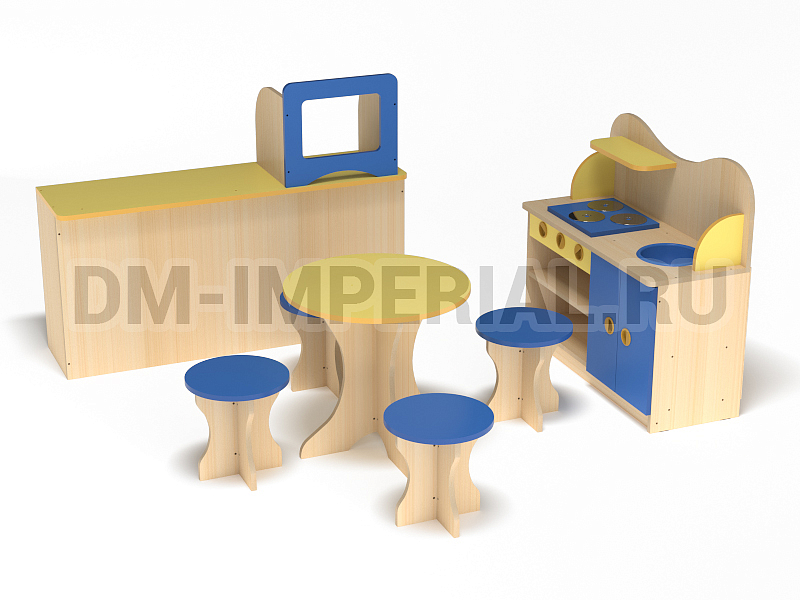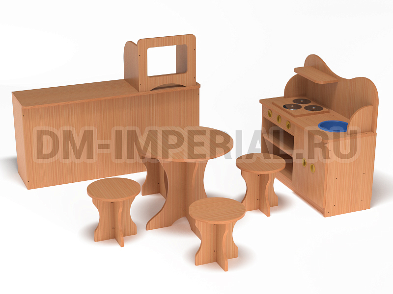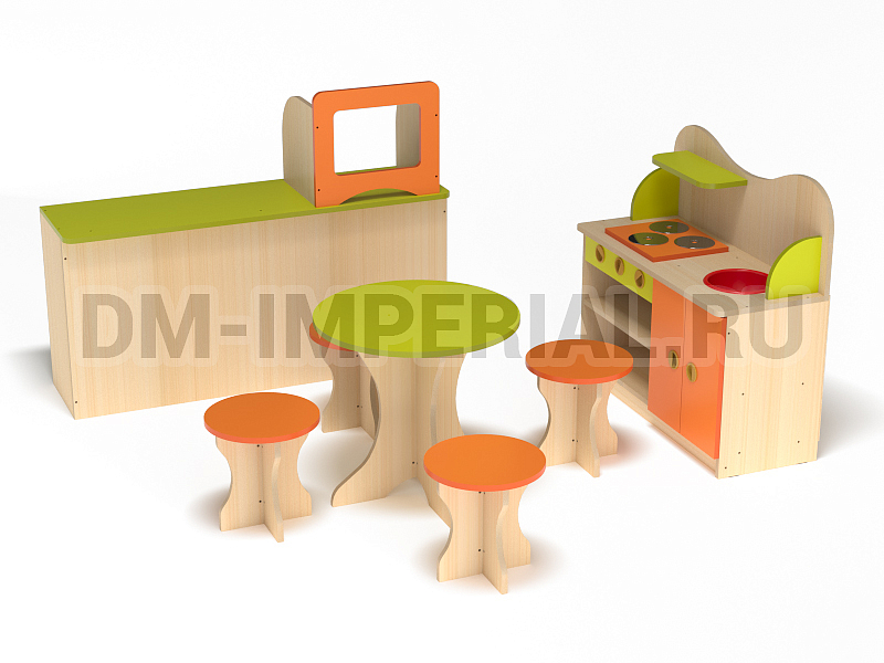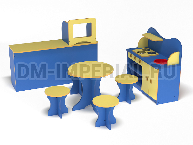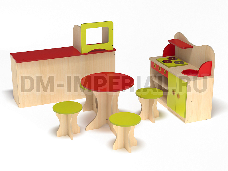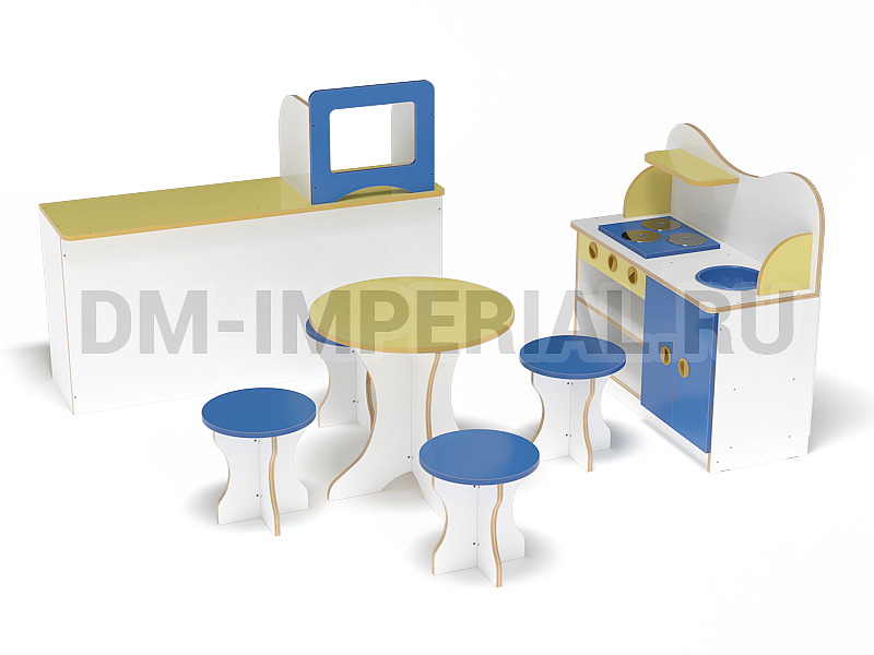 Представляем Вашему вниманию интересный игровой набор, выполненный в тематике кафе. В него входит прилавок, столик со стульчиками, а также небольшой кухонный гарнитур. Все предметы мебели высоко детализированы. На прилавке предусмотрена специальная зона, подходящая под кассовый аппарат. Гарнитур оснащается игрушечной варочной панелью и раковиной, полочками и шкафчиком.