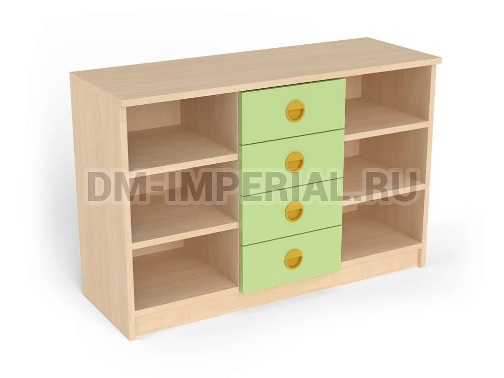 Данный стеллаж-комод отлично подойдет для оформления помещений в различных детских учебно-развлекательных заведениях. Во время проектирования дизайна мы опирались на удобство и практичность, поэтому выбрали нейтральное оформление. Модель задействует простые линии. Декор отсутствует.