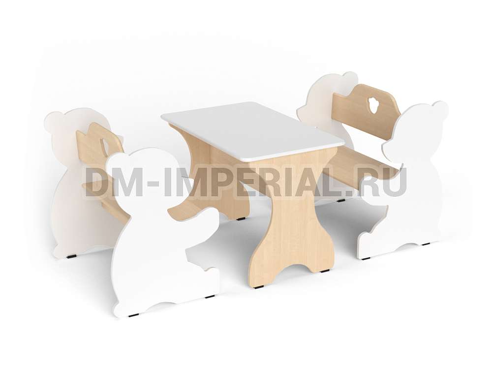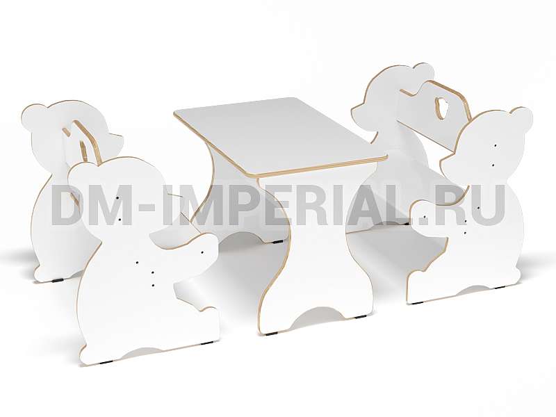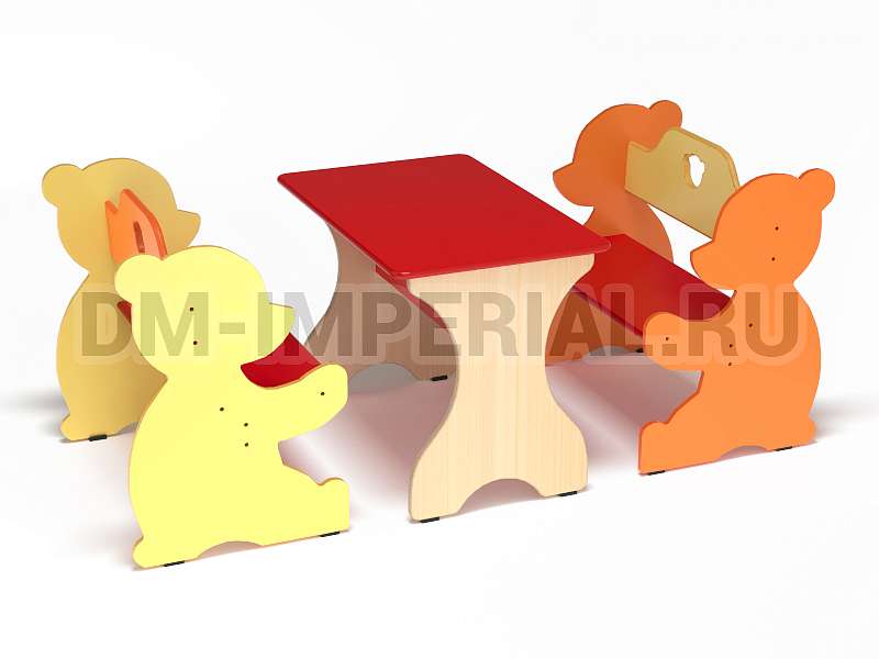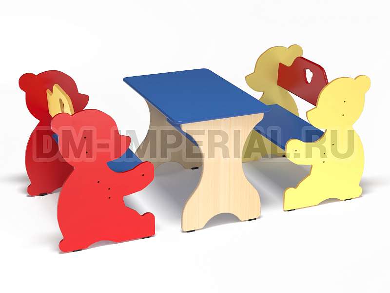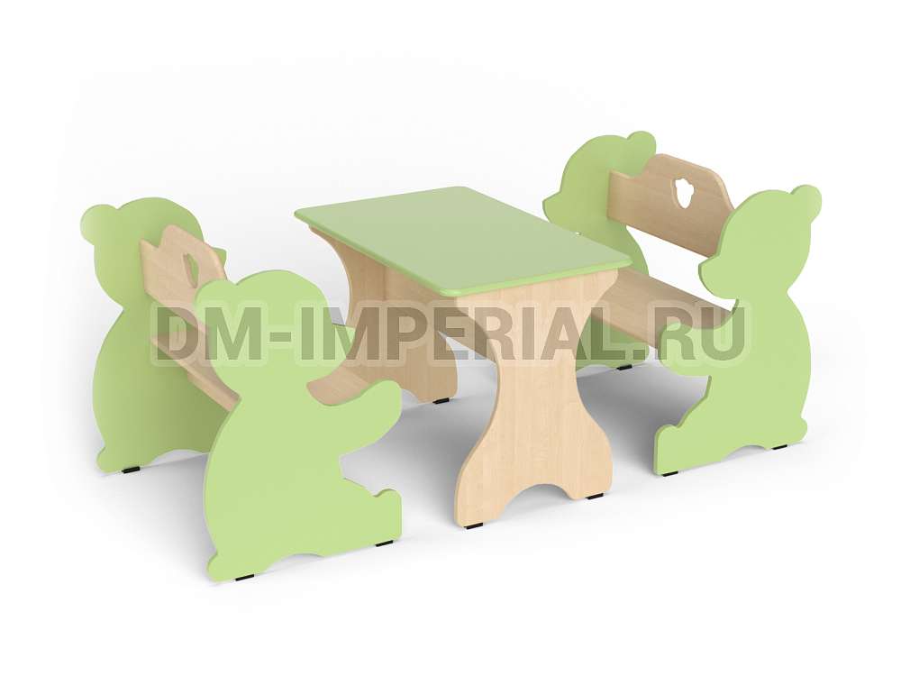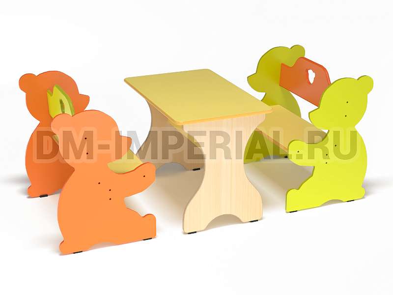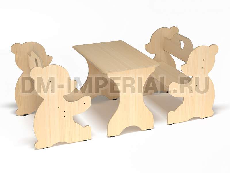 Представляем Вашему вниманию милый набор «Мишутка», в который входит столик и две лавочки. Дизайн мест для сидения и отдыха очень необычен. Боковые элементы выполнены в виде силуэтов медвежат. На спинке присутствует фигурный вырез, напоминающий мордочку медвежонка. Лавочки выглядят по-настоящему сказочно.