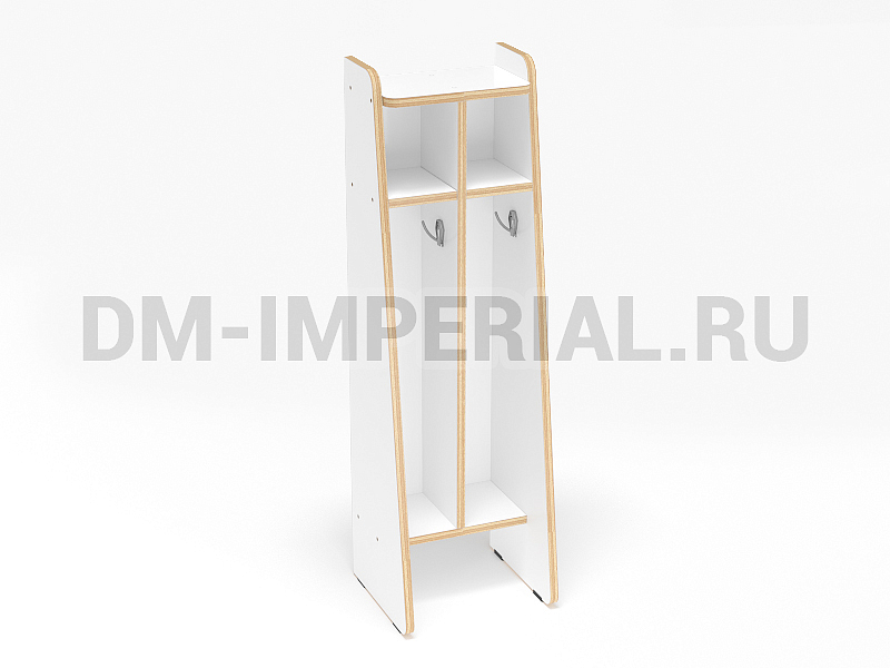 Данная модель спроектирована и изготовлена в рамках серии напольных шкафчиков для полотенец. Отлично впишется в интерьер ванной комнаты в детском дошкольном учреждении. Конструкция предназначена для пользования одновременно двумя детьми. Для каждого ребенка предусмотрена индивидуальная секция с крючком для полотенца и вместительной ячейкой сверху для хранения предметов гигиены, аксессуаров, личных вещей.