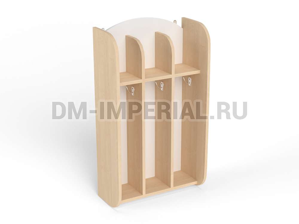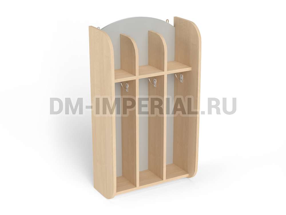 Шкафчик включает три секции для хранения для трех детей. Для каждого ребенка предусмотрено индивидуальное отделение, в котором можно разместить полотенце, а также все необходимые для проведения гигиенических процедур предметы. Интересен дизайн шкафа. Верхние полки не имеют ограничения сверху, что делает конструкцию визуально более легкой и красивой.
