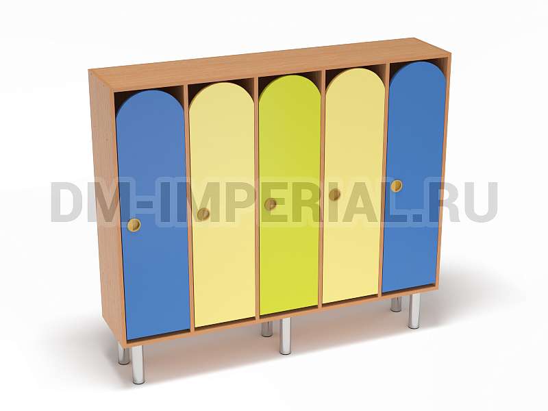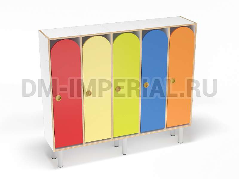 Данный шкаф выпускается в рамках детской мебели для оснащения раздевалок и является самым большим в линейке моделей с ножками. Габариты конструкции - 1490*320*1320 мм. Шкаф оснащается пятью секциями и предназначен, соответственно, для пользования одновременно пятью детьми. Для каждого ребенка предусмотрен свой, индивидуальный шкафчик с закрывающейся дверцей. Внутри есть все необходимое для аккуратного размещения личных вещей.