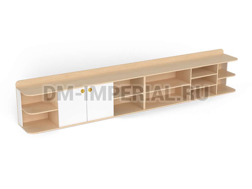 Данная модель игрового стеллажа имеет необычную конструкцию. Габариты: 3420х420х600 мм. Модель выполнена низкой, но длинной. Она отлично впишется в пространство комнаты, компактно и аккуратно располагаясь вдоль стены. Свободное пространство над стеллажом можно интересно оформить. Организовать дополнительную вертикальную систему хранения (например, с помощью полок) или остановиться на украшении декором (рамочками с изображениями, панно и т.д).