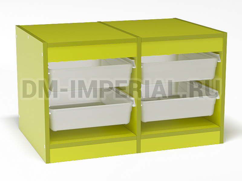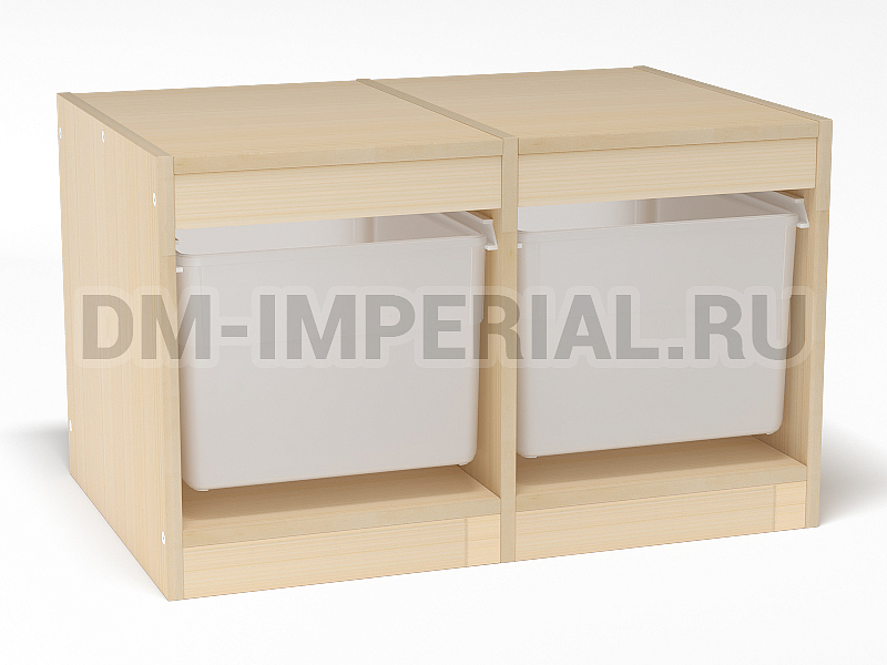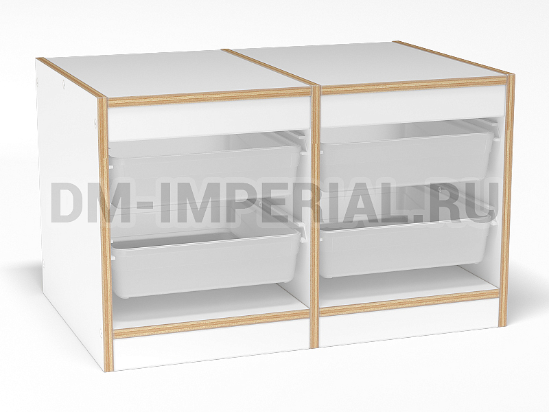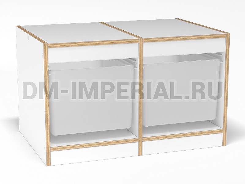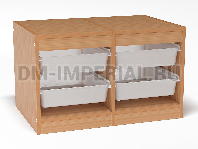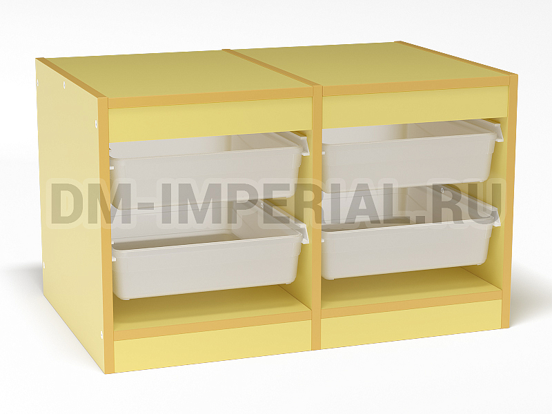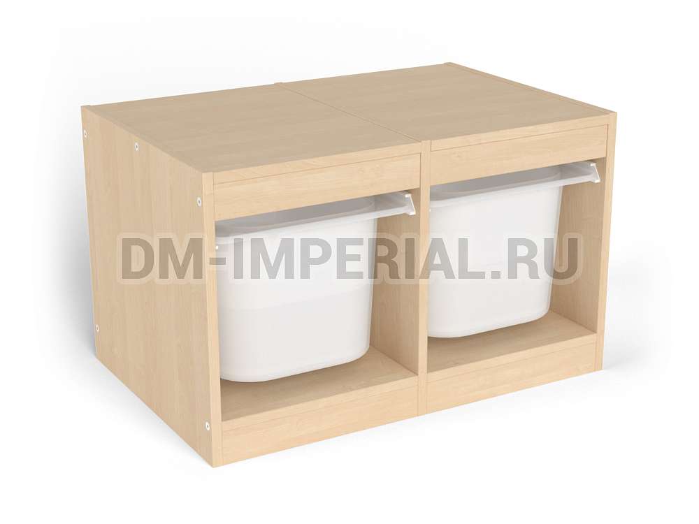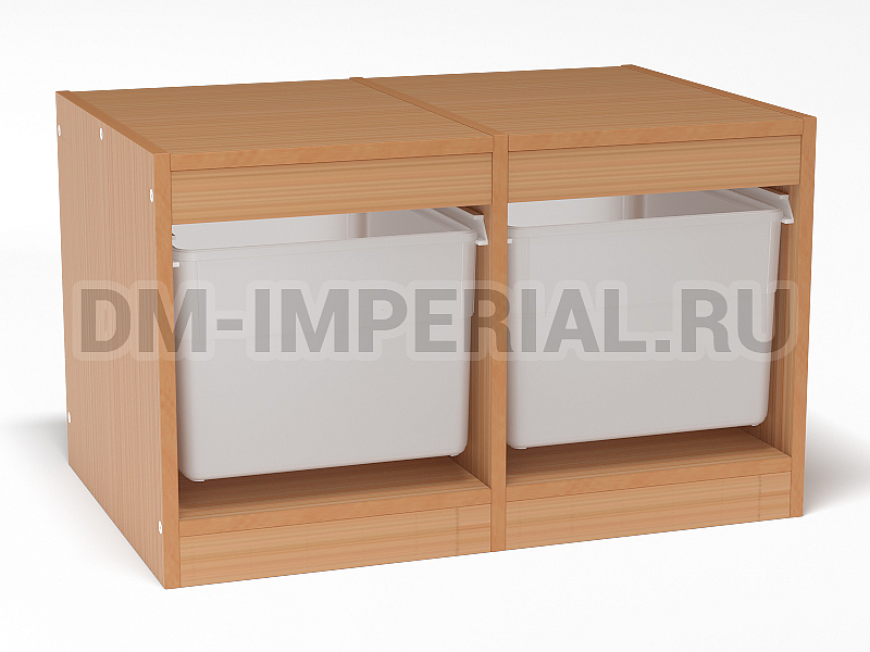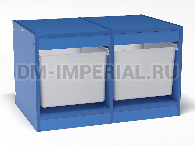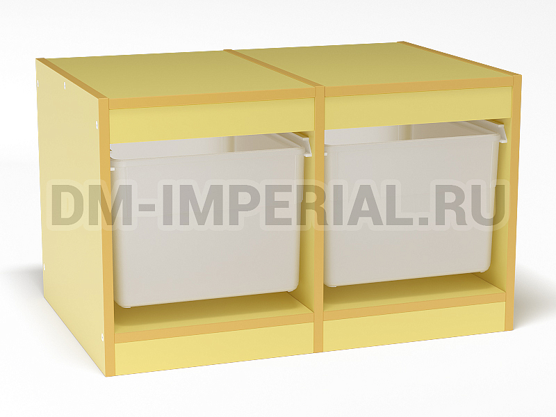 Двухсекционный стеллаж для хранения изготавливается согласно требованиям ГОСТ, ФГОС и СанПиН к безопасности и удобству использования детской мебели. В процессе производства использовались исключительно разрешенные, не токсичные, экологичные материалы. Окрашивания выполняются стойкими к истиранию, устойчивыми к механическим повреждениям составами. Контейнеры пластиковые.