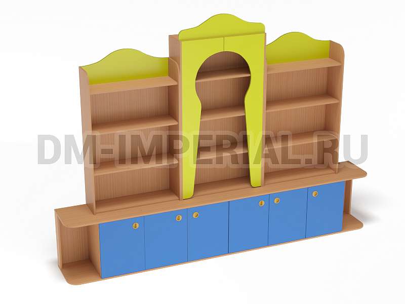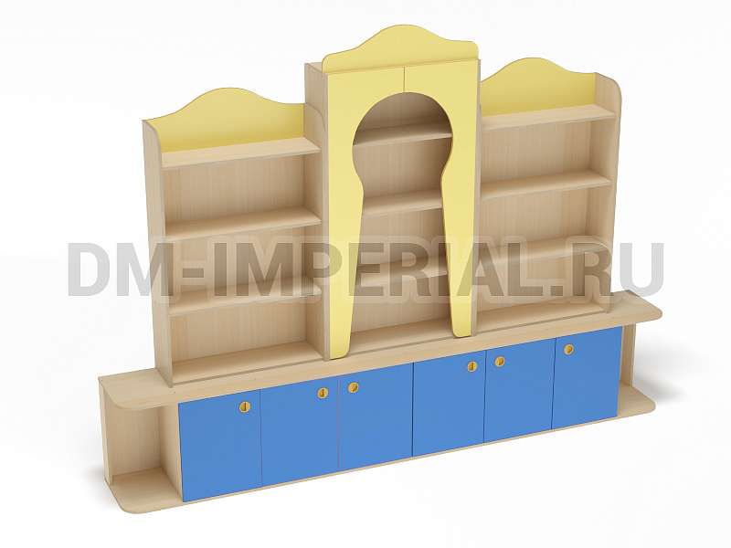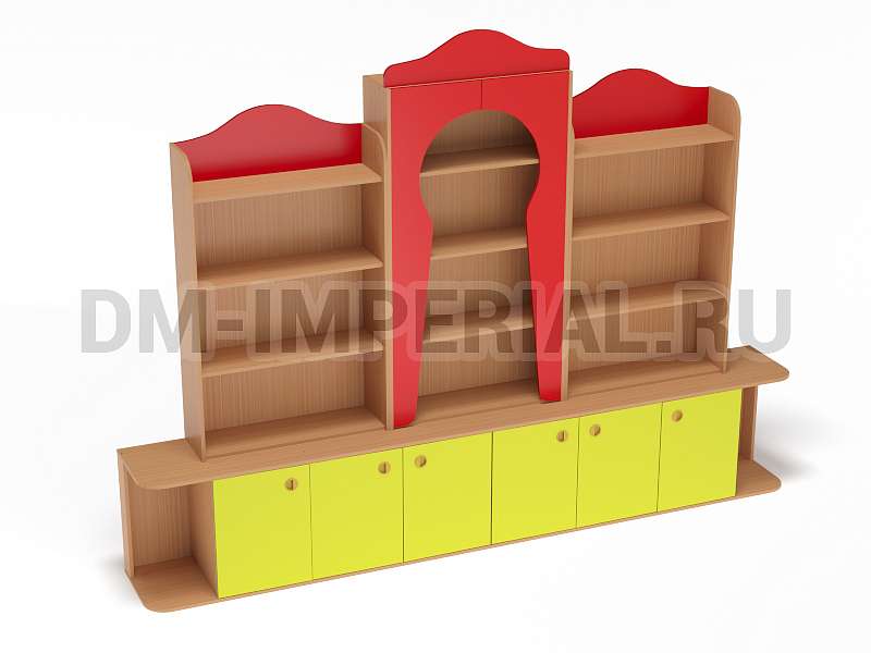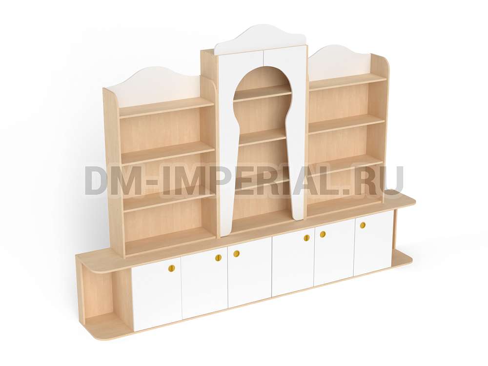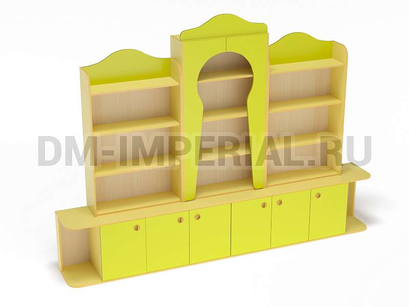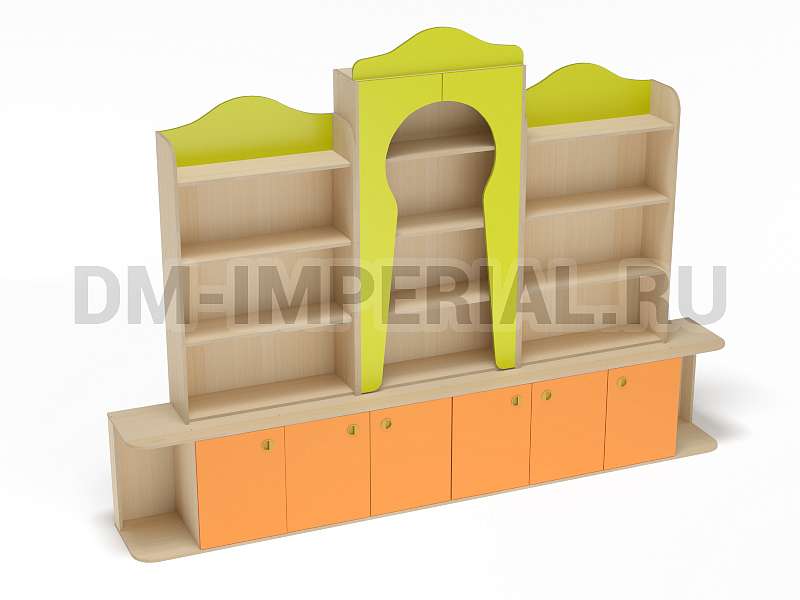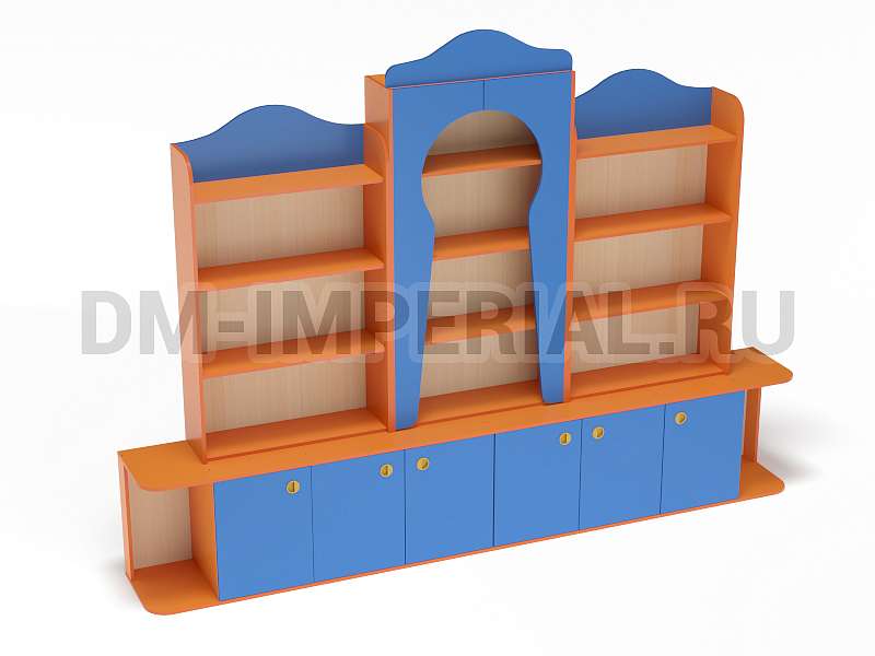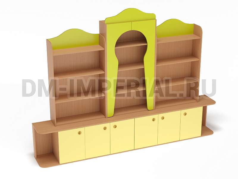 Детская стенка «Полина» - это довольно большая конструкция (габариты - 3100х420х2920 мм), требующая детального планирования интерьера помещения. Необычный дизайн мебели визуально разгружает конструкцию. Стеллаж состоит из двух частей: нижних закрытых шкафчиков и верхних открытых полок. Верхняя часть уже нижней, по бокам предусмотрены открытые шкафчики. Кроме того, на верхнем ярусе использованы интересные элементы декора. Все эти приемы делают стеллаж изящным.