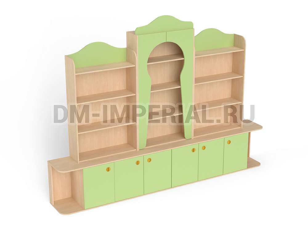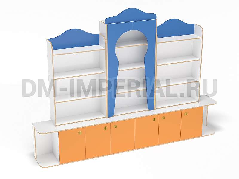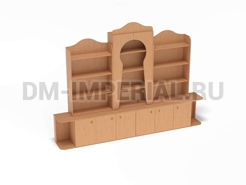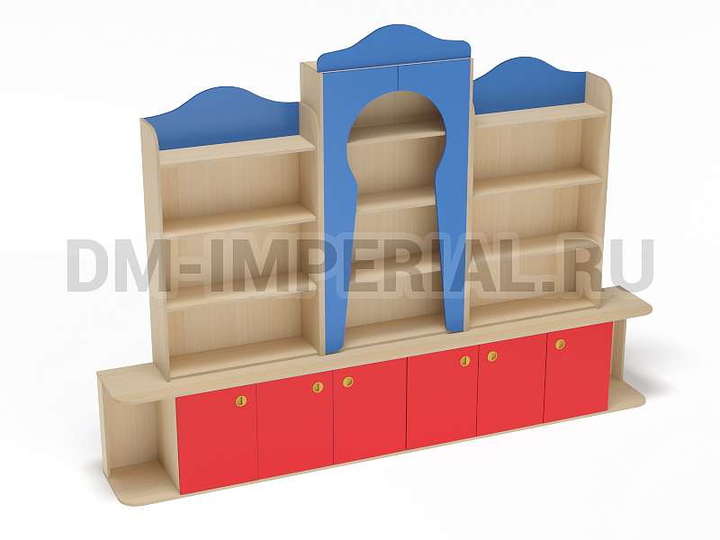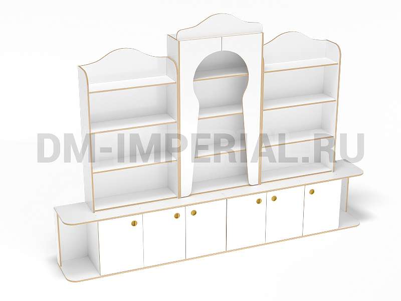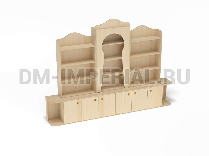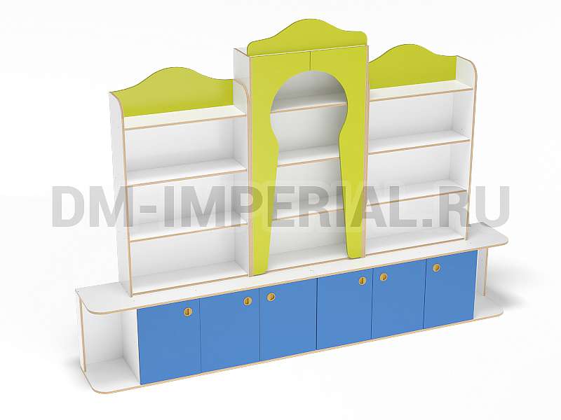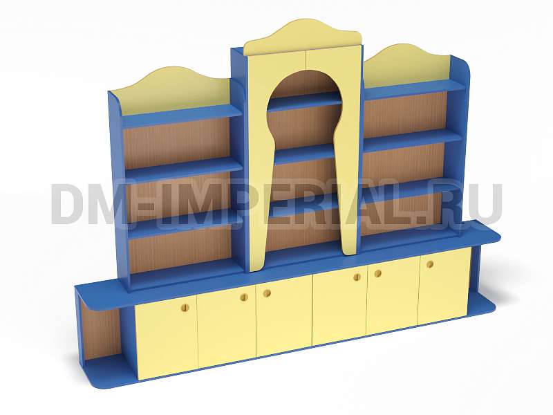Детская стенка «Полина» - это довольно большая конструкция (габариты - 3100х420х2920 мм), требующая детального планирования интерьера помещения. Необычный дизайн мебели визуально разгружает конструкцию. Стеллаж состоит из двух частей: нижних закрытых шкафчиков и верхних открытых полок. Верхняя часть уже нижней, по бокам предусмотрены открытые шкафчики. Кроме того, на верхнем ярусе использованы интересные элементы декора. Все эти приемы делают стеллаж изящным.