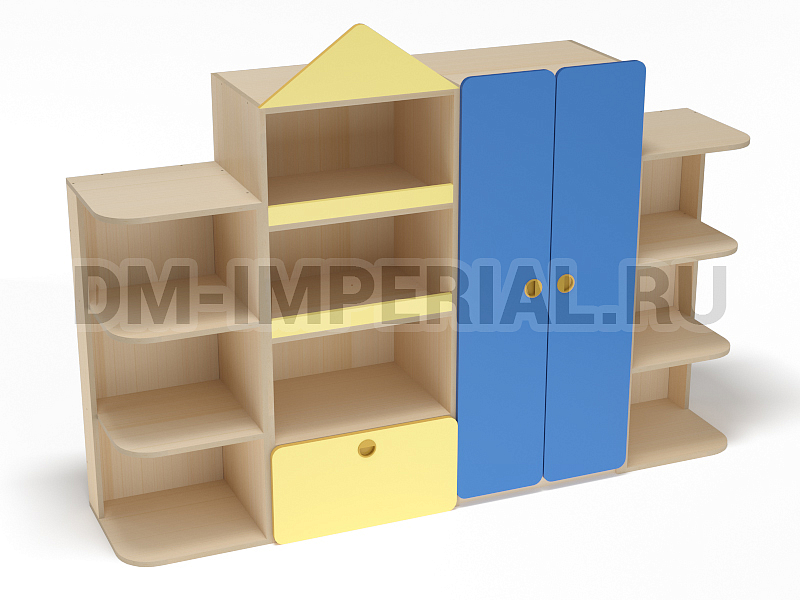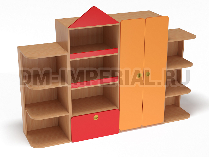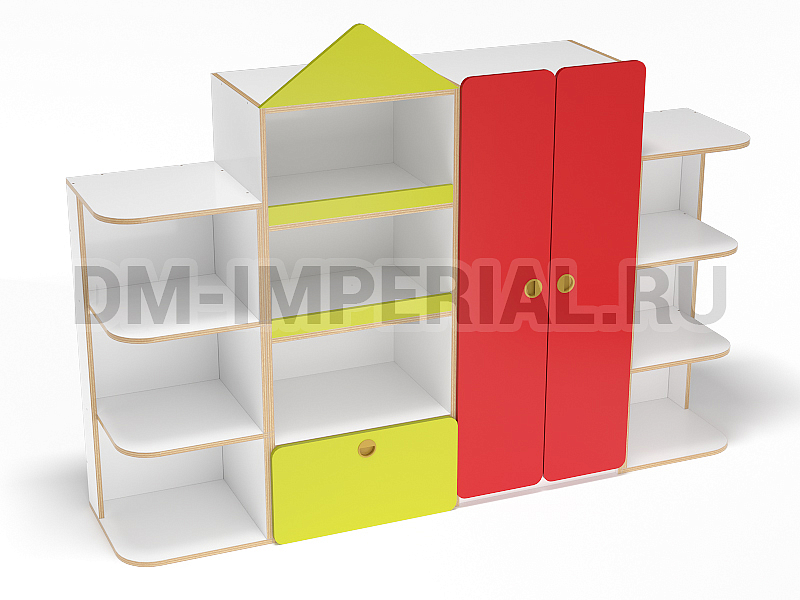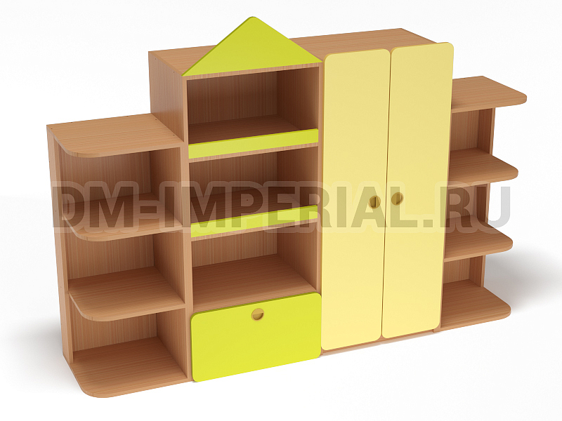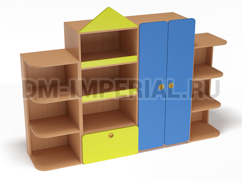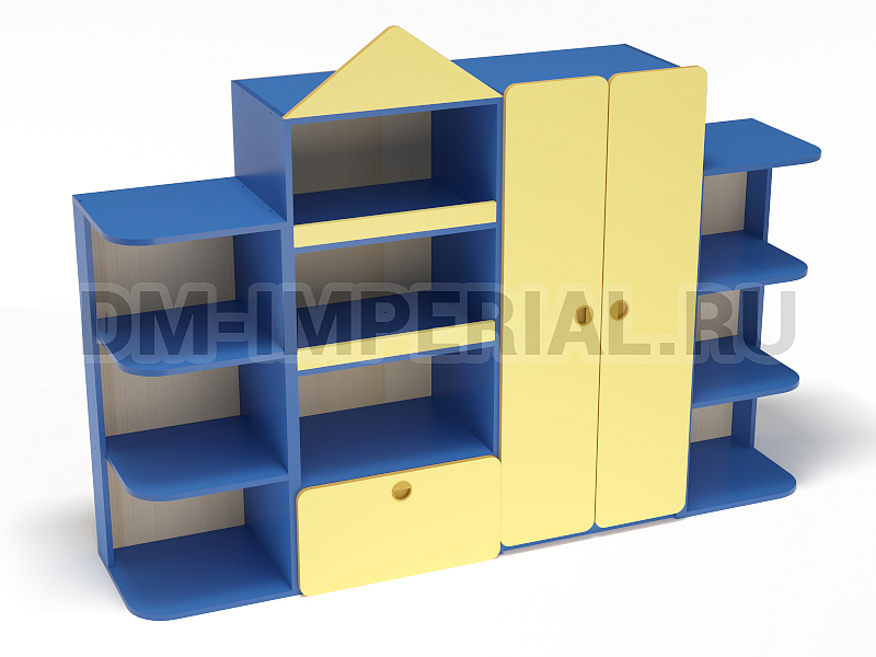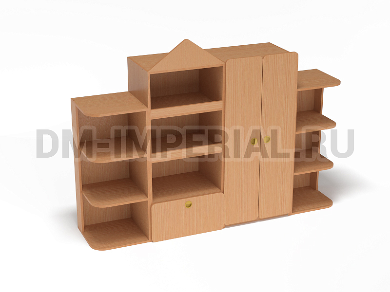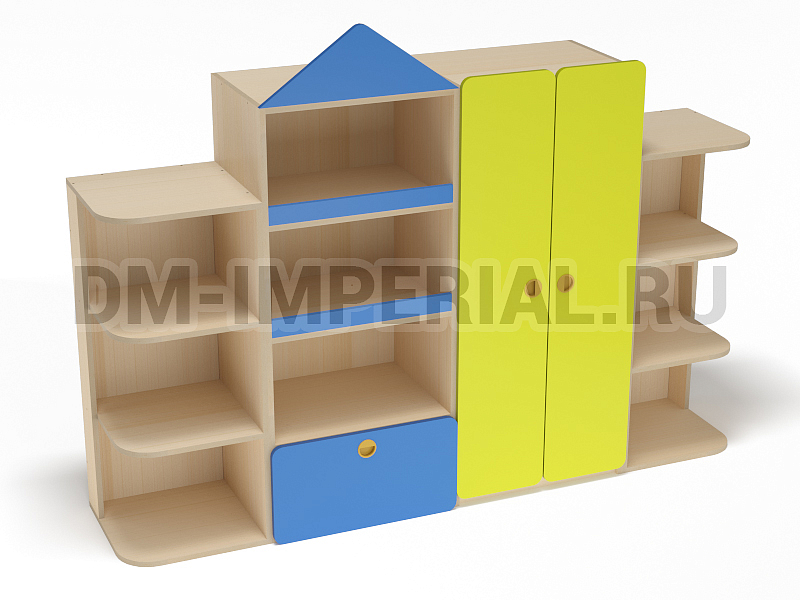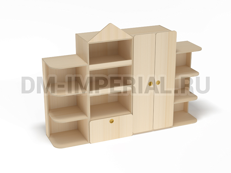 Конструкция детской стенки «Юлия» представляет собой комбинированную систему хранения, состоящую из нескольких секций. Включает открытые и закрытые отделения. В середине располагается высокий стеллаж и шкаф с дверцами. По бокам - открытые секции. Конструкция достаточно массивна. Размеры - 1960х440х1450 мм.