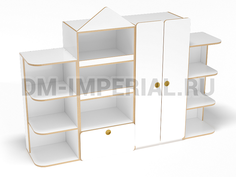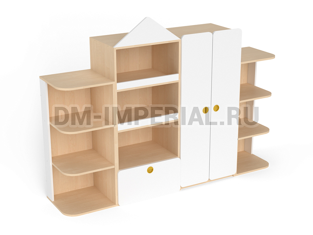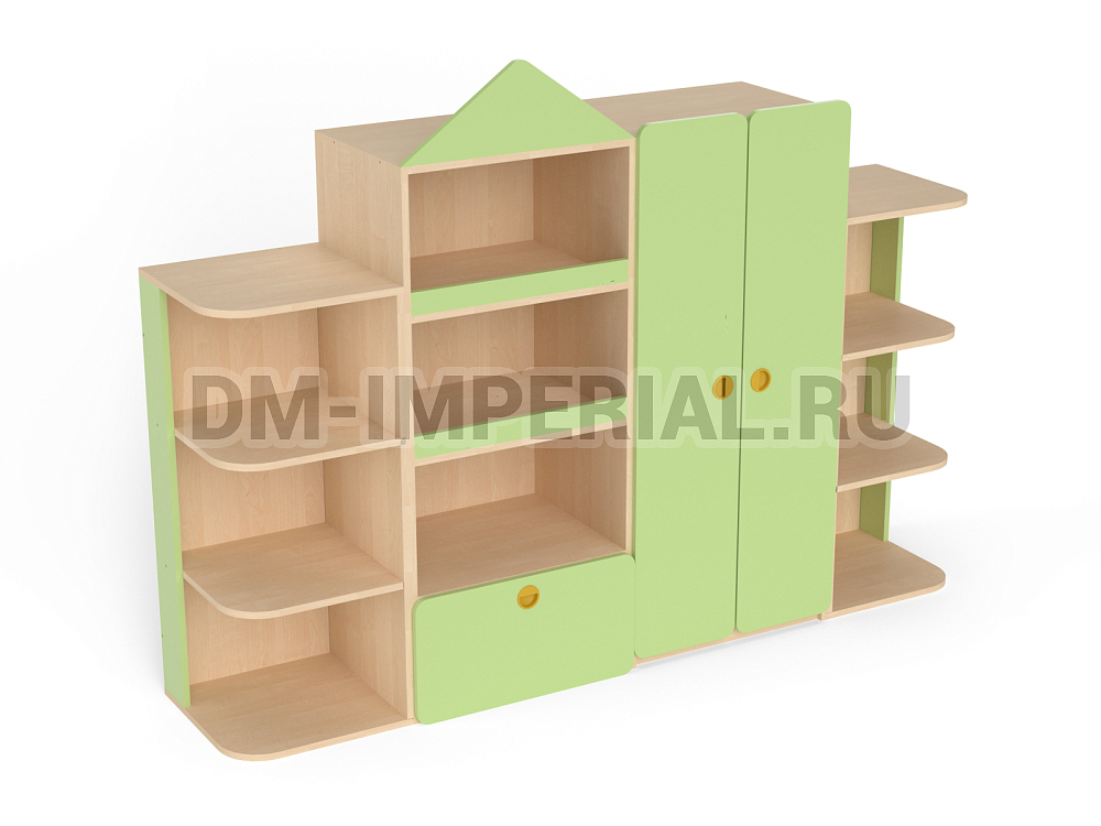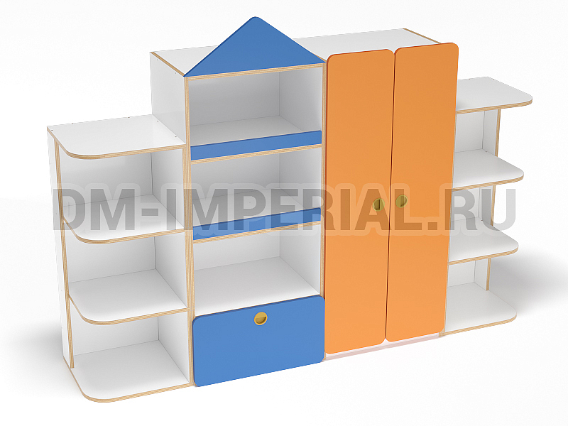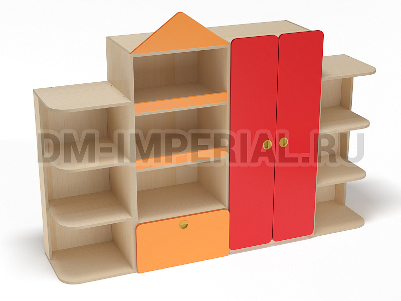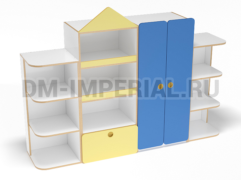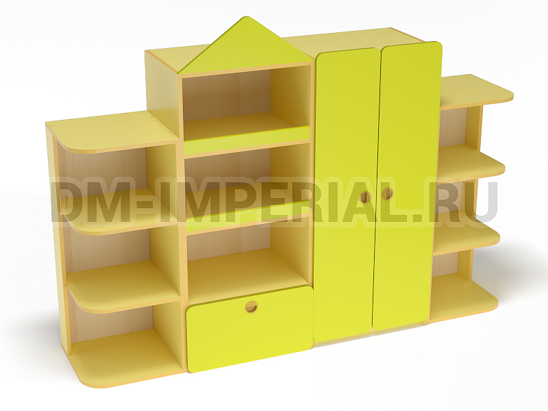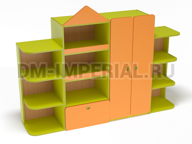 Конструкция детской стенки «Юлия» представляет собой комбинированную систему хранения, состоящую из нескольких секций. Включает открытые и закрытые отделения. В середине располагается высокий стеллаж и шкаф с дверцами. По бокам - открытые секции. Конструкция достаточно массивна. Размеры - 1960х440х1450 мм.