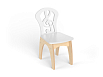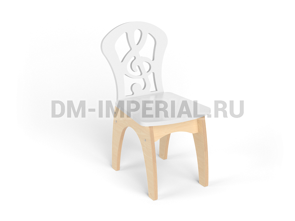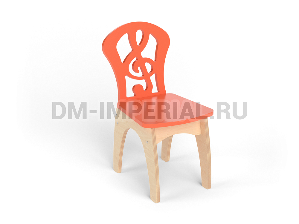 Ростовая группа 00; 0; 1; 2; 3. Тип каркаса Деревянный. Регулировка по высоте Нет. Вид материала спинки/сиденья Фанера. Форма сидения трапециевидное сидение, углы закруглены. Форма спинки фрезерованная и визуально делится по высоте на две части. Та часть, которая выступает над сидением, по форме напоминает песочные часы. В центре спинки выфрезеровано изображение. Вторая часть спинки, которая ниже сидения, имеет фрезерованный волнообразный нижний край. Изображение на спинке скрипичный ключ; нота. Форма опор Опоры стула имеют дугообразную (∩) форму, объединяя переднюю и заднюю ножки. Ножки широкие в верхней части и узкие в нижней. Толщина фанеры 15 мм. Покрытие спинки и сидения комбинированное покрытие – слой грунта и слой цветного лака. Покрытие боковых частей, ножек и планок бесцветный лак в 2 слоя.