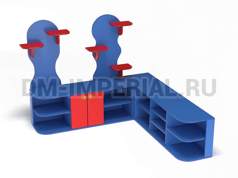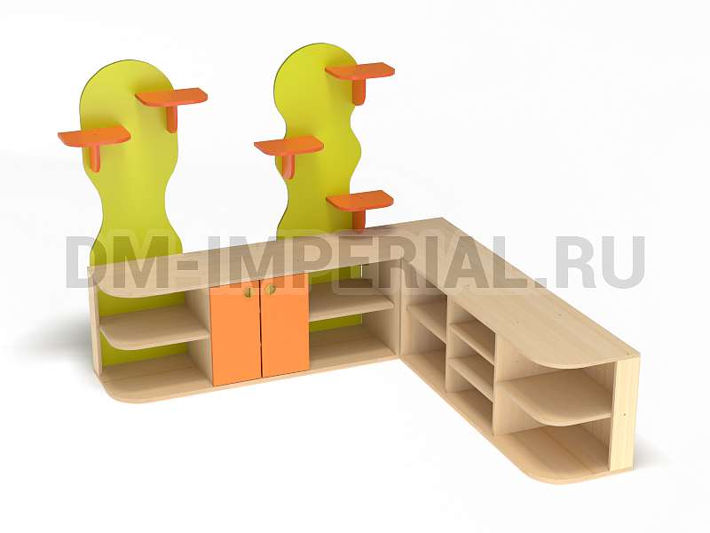 Данная модель обладает увеличенными габаритами (1720/1720х420х1400 мм) и является угловой, что накладывает определенные требования к планированию интерьера пространства. Мебель универсальна и может применяться для оформления различных тематических уголков. В целом размеры позволяют совместить несколько развлекательных зон, например, творческую и по изучению живой природы.